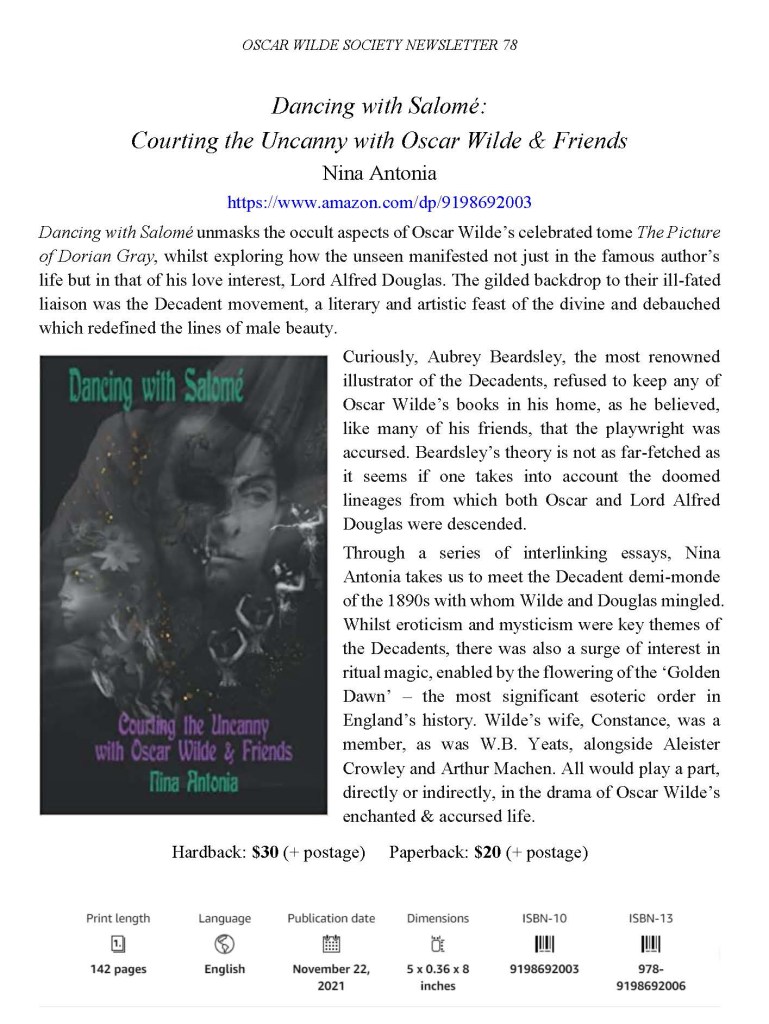 Dancing with Salomé: Courting the Uncanny with Oscar Wilde & Friends by Nina Antonia is featured in Oscariana: The Oscar Wilde Society e-Newsletter (#78 December 2021).